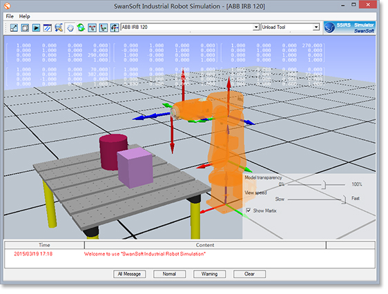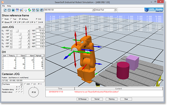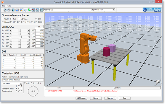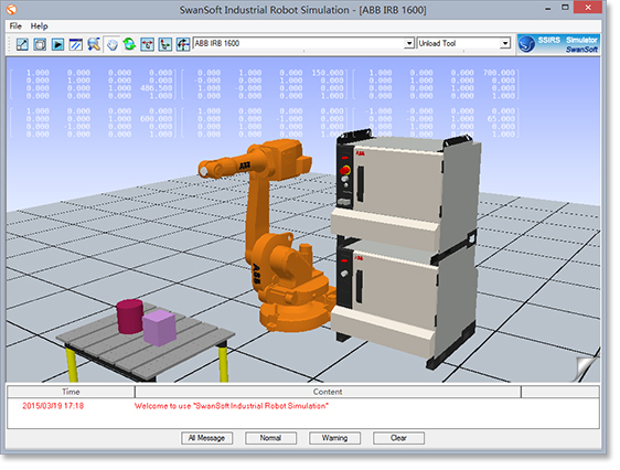 Swansoft Industrial Robot Simulation (SSIRS) is a 3D simulation of serial six-axis industrial robots developed by Nanjing Swansoft Technology Company. The SSIRS package comes with several popular industrial robot models (ABB IRB 120, ABB IRB 140, ABB IRB 1410, ABB IRB 1600) as well as with several end-effector tools. The virtual robot have the abilities of rolling, pitching and deflection. The user can jog the virtual robot in either its joint space or the Cartesian space (with respect to the tool frame, the base frame, or the world frame). The user can be familiar with operation of the robot within a short time by using the simulator.