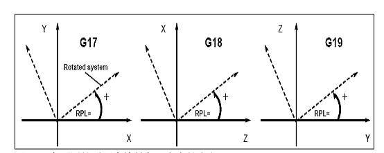 1)功能 在當(dāng)前的平面G17或G18或G19中執(zhí)行旋轉(zhuǎn),值為RPL=…,單位是度。