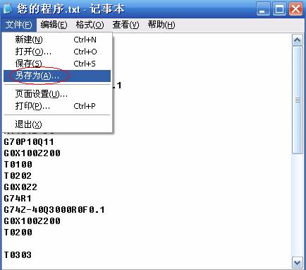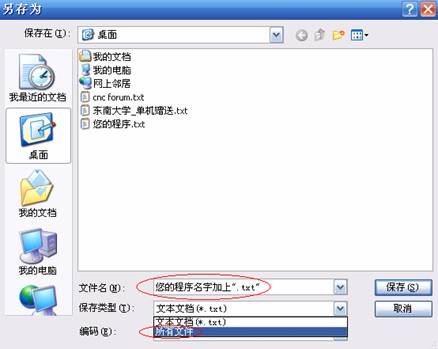 4.將文件"另存為",保存類型改為"所有文件",文件名寫成"您的程序名字加上.txt"(如是FANUC系列的也可加上.nc或者.cnc;如是SIEMENS系列的可加上.mpf或者.spf)。