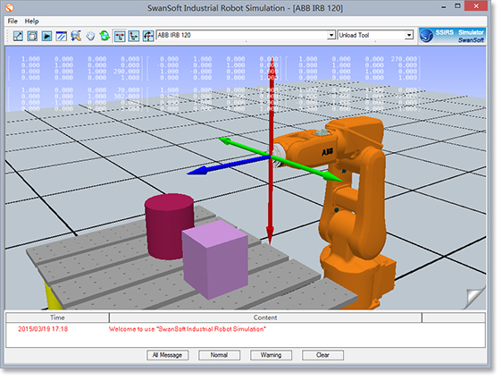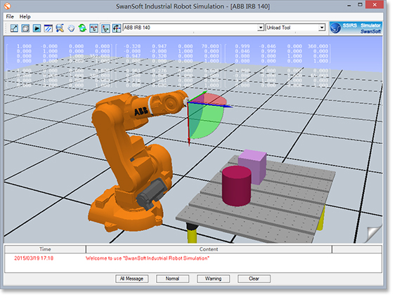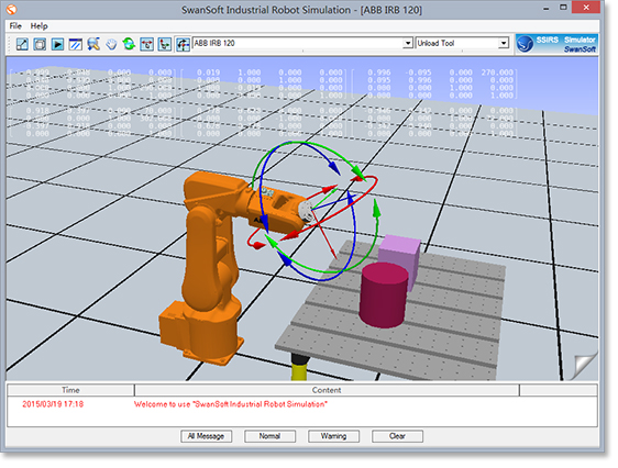 Swansoft Industrial Robot Simulation (SSIRS) is a 3D simulation of serial six-axis industrial robots developed by Nanjing Swansoft Technology Company. The SSIRS package comes with several popular industrial robot models (ABB IRB 120, ABB IRB 140, ABB IRB 1410, ABB IRB 1600) as well as with several end-effector tools. The virtual robot have the abilities of rolling, pitching and deflection. The user can jog the virtual robot in either its joint space or the Cartesian space (with respect to the tool frame, the base frame, or the world frame). The user can be familiar with operation of the robot within a short time by using the simulator.